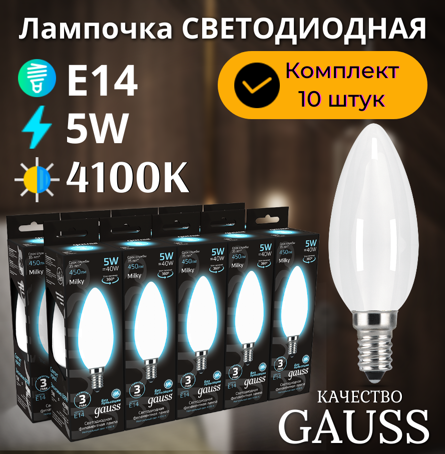 Упаковка светодиодных ламп 10 шт. gauss 103201205, E14, C35, 5Вт, 4100 К
