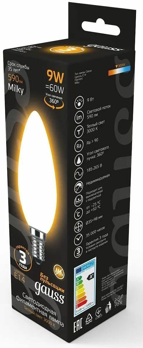 Лампа светодиодная Е14 Свеча 9W теплый свет 3000К упаковка 10 шт. Gauss Filament