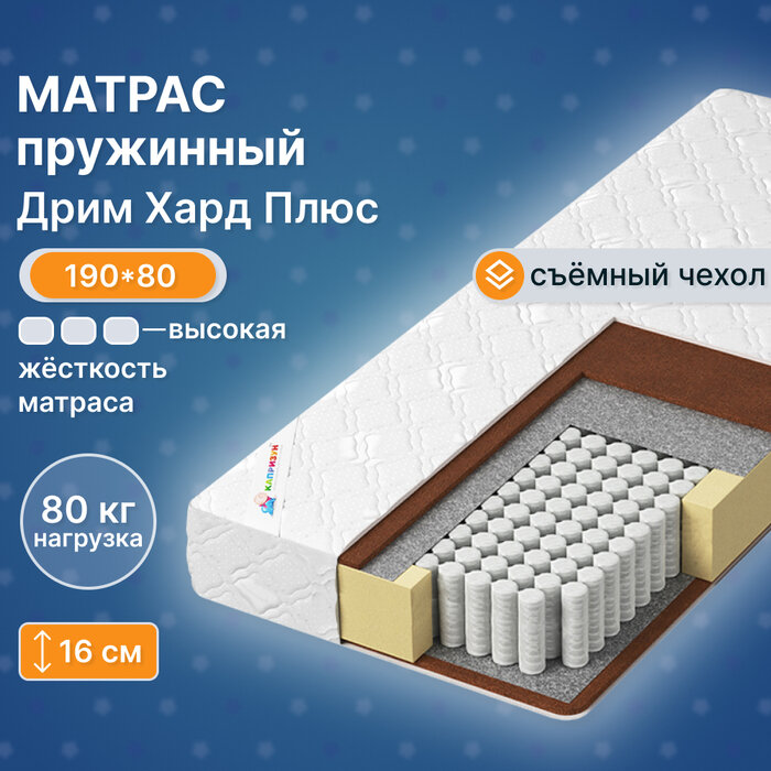 Матрас "Дрим Хард", 160x90x16 см, независимые пружины, кокосовая койра, съемный чехол, жесткий, пружинный блок 512 на место
