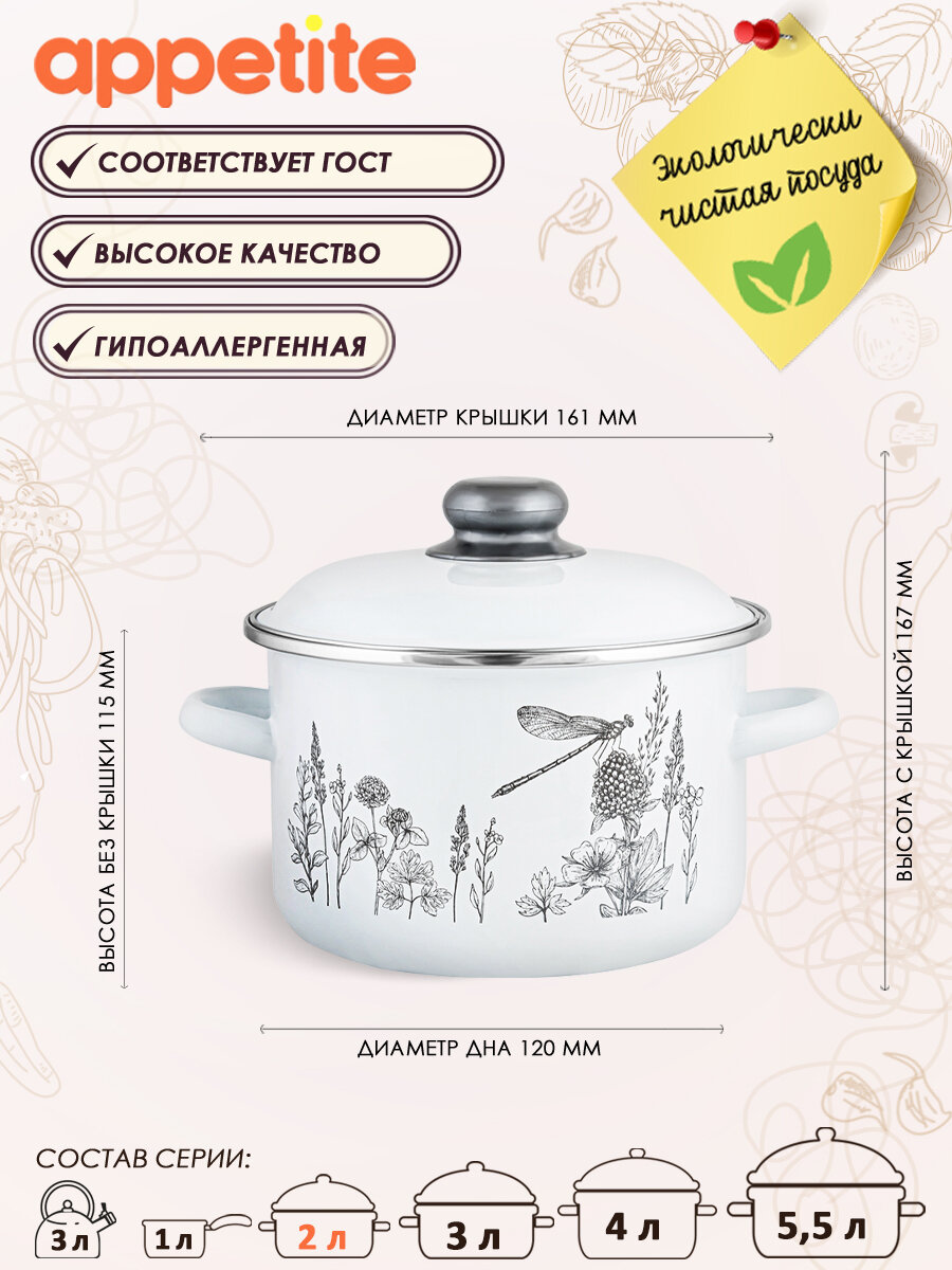 Кастрюля эмалированная Appetite FLORA-2, с крышкой, 2 л