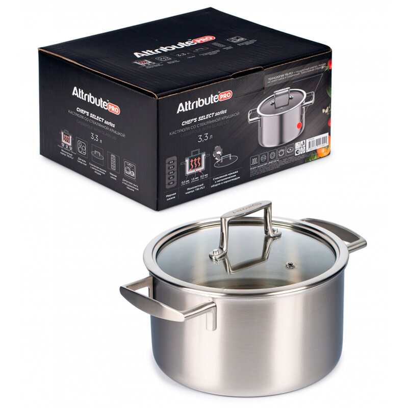 Кастрюля из нержавеющей стали Chef`s Select 3,3 л со стеклянной крышкой Attribute Pro