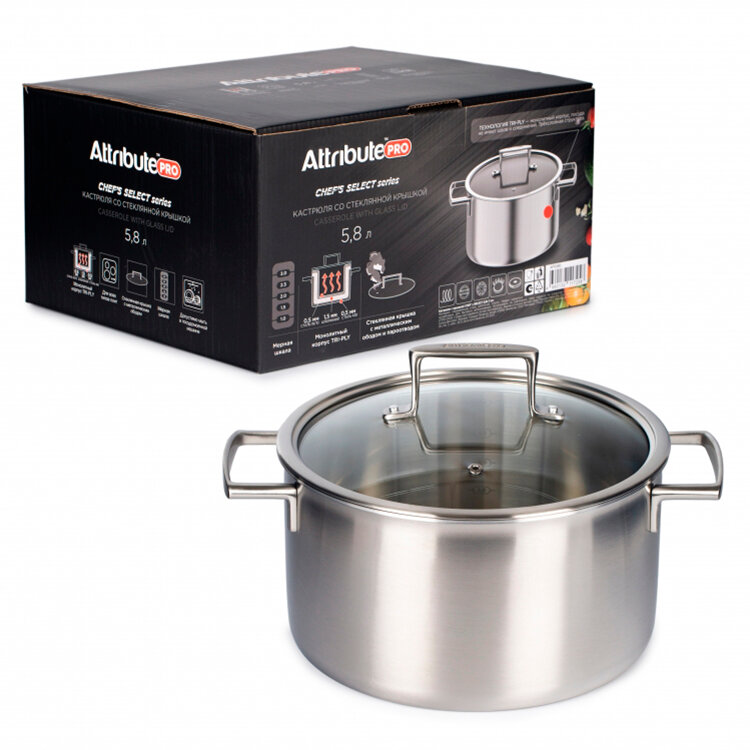 Кастрюля из нержавеющей стали Attribute Pro Chef`s Select 5,8 л со стеклянной крышкой