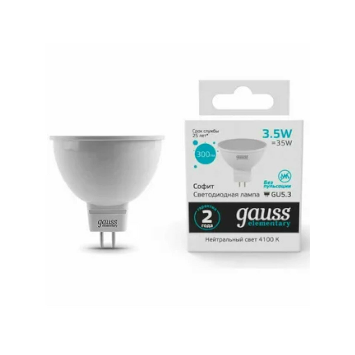 (2 шт.) Светодиодная лампочка Gauss MR16, мощность 3.5Вт, напряжение питания 220В, цветовая температура 4100K, нейтральный белый свет, цоколь GU5.3, размер 50х50 мм