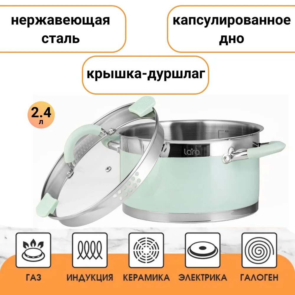 Купить Кастрюля LARA MINT LR02-541, 2,4л, 18x10 см, индукц. дно, крышка-дуршлаг
