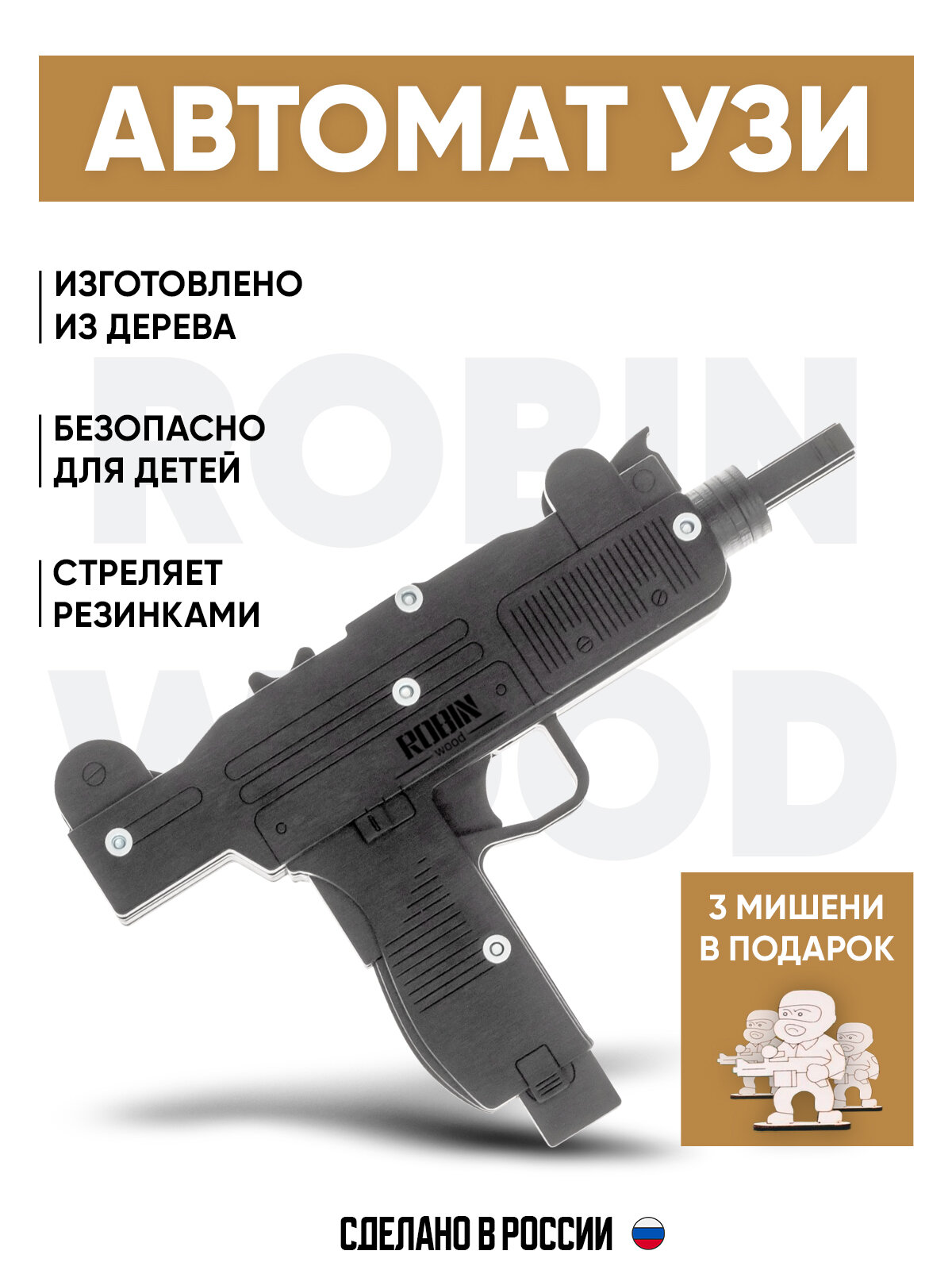 | Дополнительная информация | сделан из березовой фанеры 1-го сорта; нержавеющая металлическая фурнитура; покрыт акриловой краской на водной основе; заряды в комплекте из 100%-ного каучука; покраска и сборка производятся вручную; для детей от 3 лет |