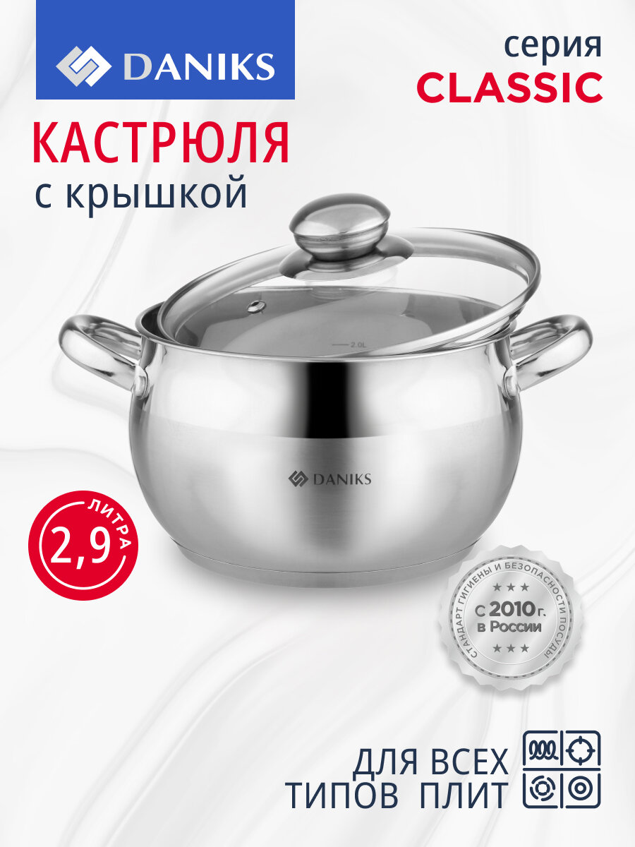 Кастрюля нержавеющая сталь Daniks 2,9л. индукция Классика
