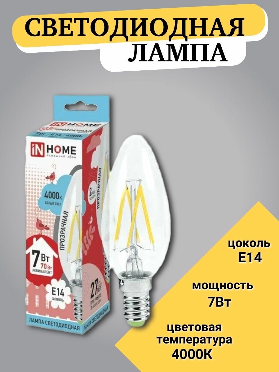 Светодиодная LED лампа свеча нитевидная IN HOME E14(е14) 7W (Вт) 4000K 630lm 100x35 220V filament прозрачная 4690612007618