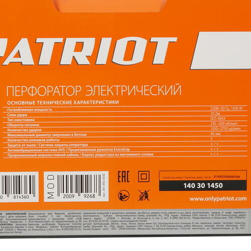 Ниже Вы можете прочитать отзывы на Перфоратор PATRIOT RH 450 (1300 Вт, SDS-MAX 3 режима, 10Дж., рег. скорость кейс), ознакомится с подробными характеристиками, посмотреть интересные обзоры и фотографии на Перфоратор PATRIOT RH 450 (1300 Вт, SDS-MAX 3 режима, 10Дж., рег. скорость кейс).