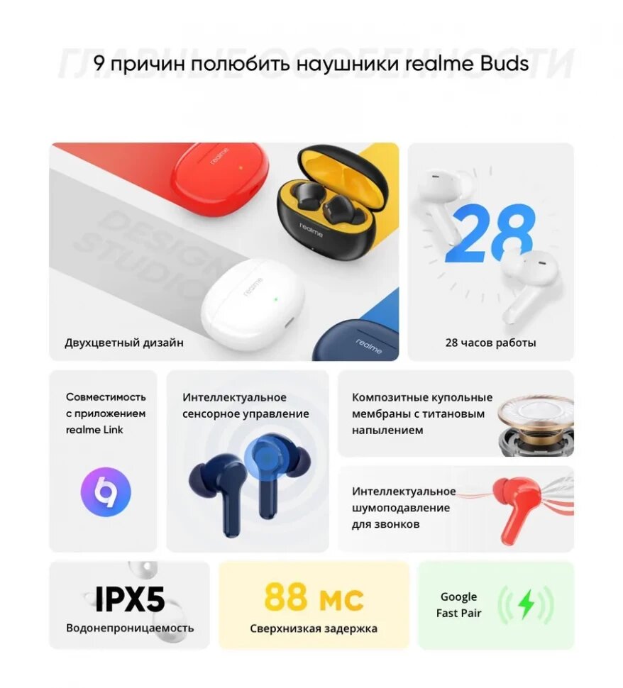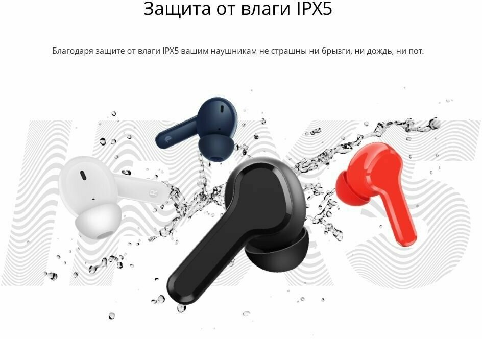 | Комплектация | realme Buds T100, руководство пользователя, амбушюры 6 шт |