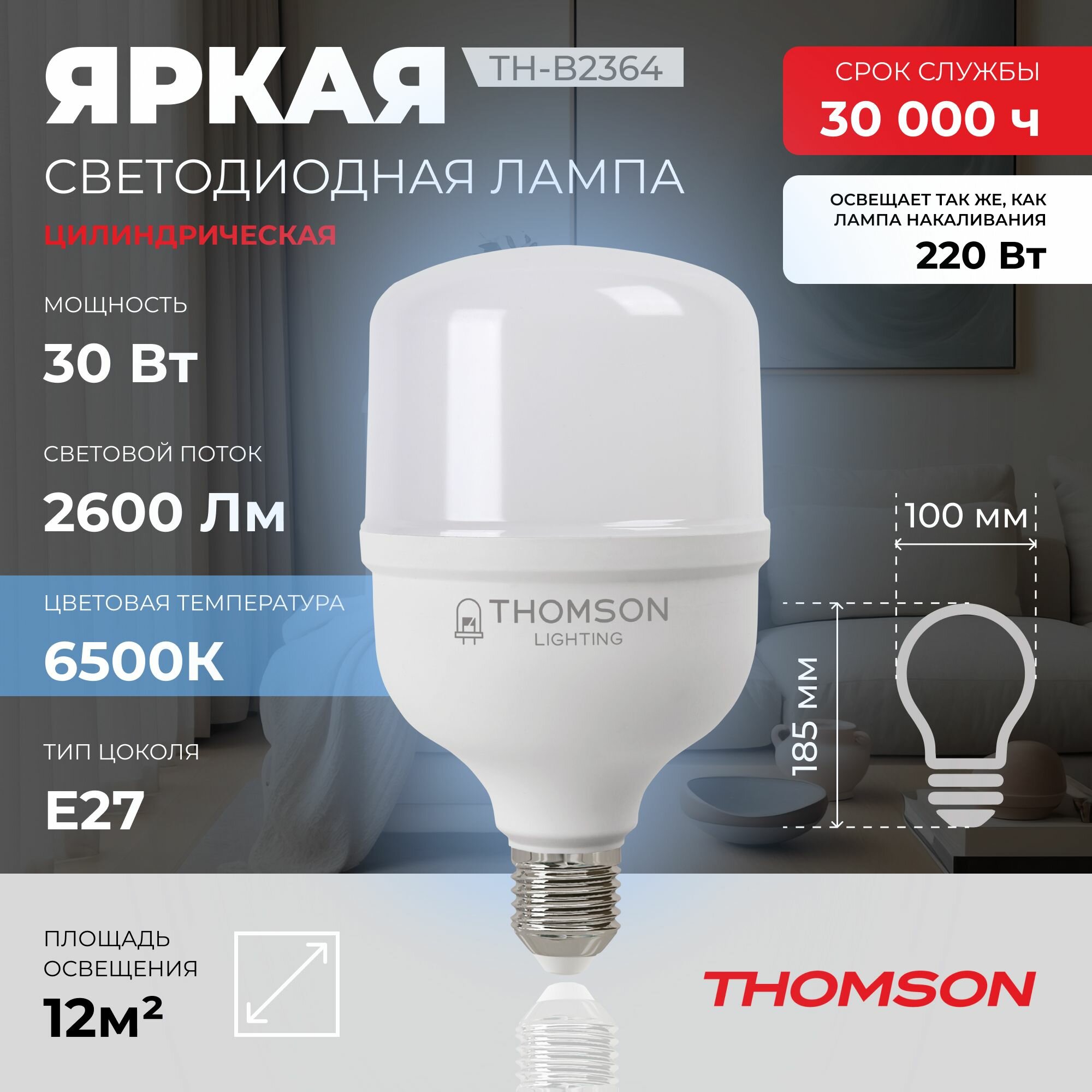 Лампочка Thomson TH-B2364 30 Вт, E27, 6500K, цилиндр, T100, холодный белый свет