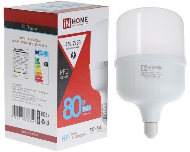 Лампа светодиодная IN HOME LED-HP-PRO, 80 Вт, 230 В, E27, с адаптером, Е40, 6500 К, 7600 Лм