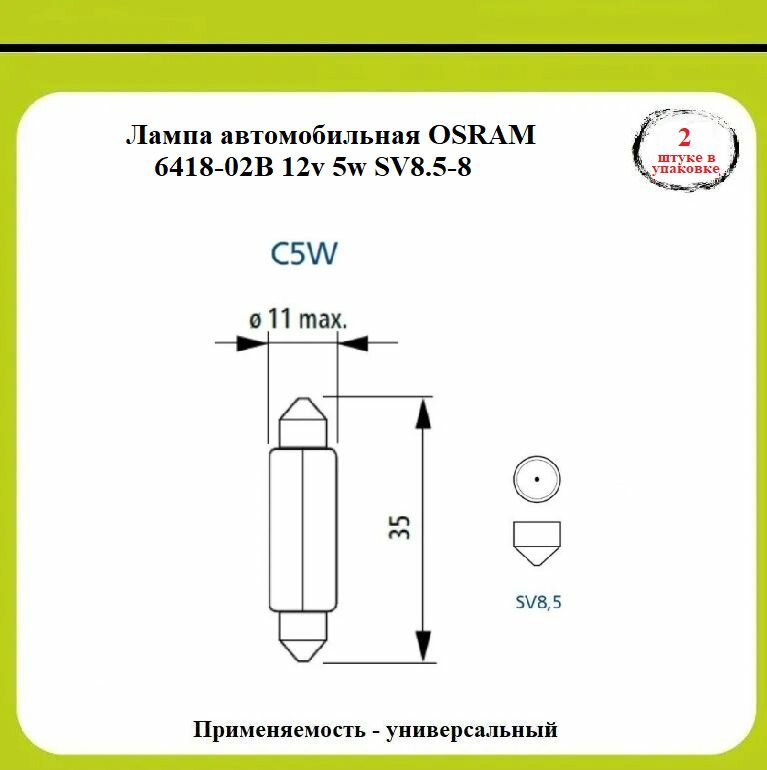 OSRAM Автолампа C5W SV8.5,8 35мм , 2шт 12V ,1,10 6418-02B