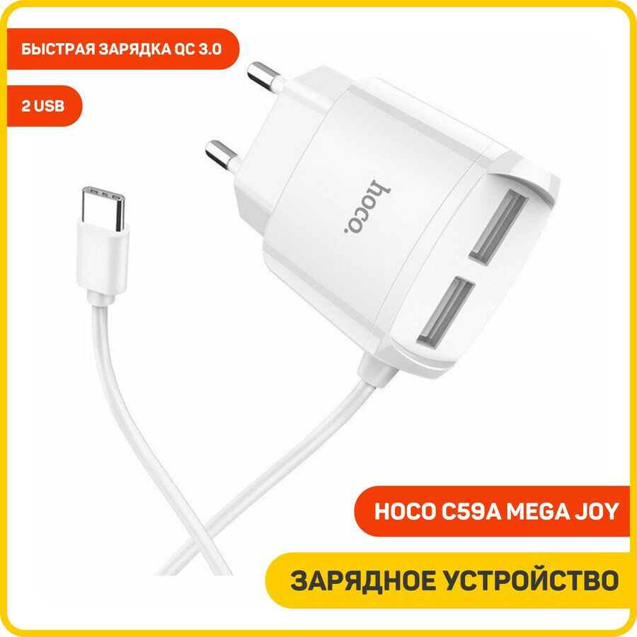Сетевое зарядное устройство (СЗУ) Hoco C59A Mega joy (2 USB) + кабель Type-C, 2.4 А, белый