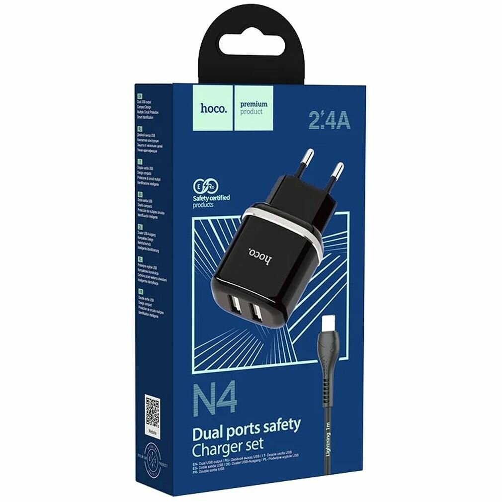 hoco N4 Aspiring зарядное устройство с двумя USB выходами 2.4A, с кабелем Lightning - черный
