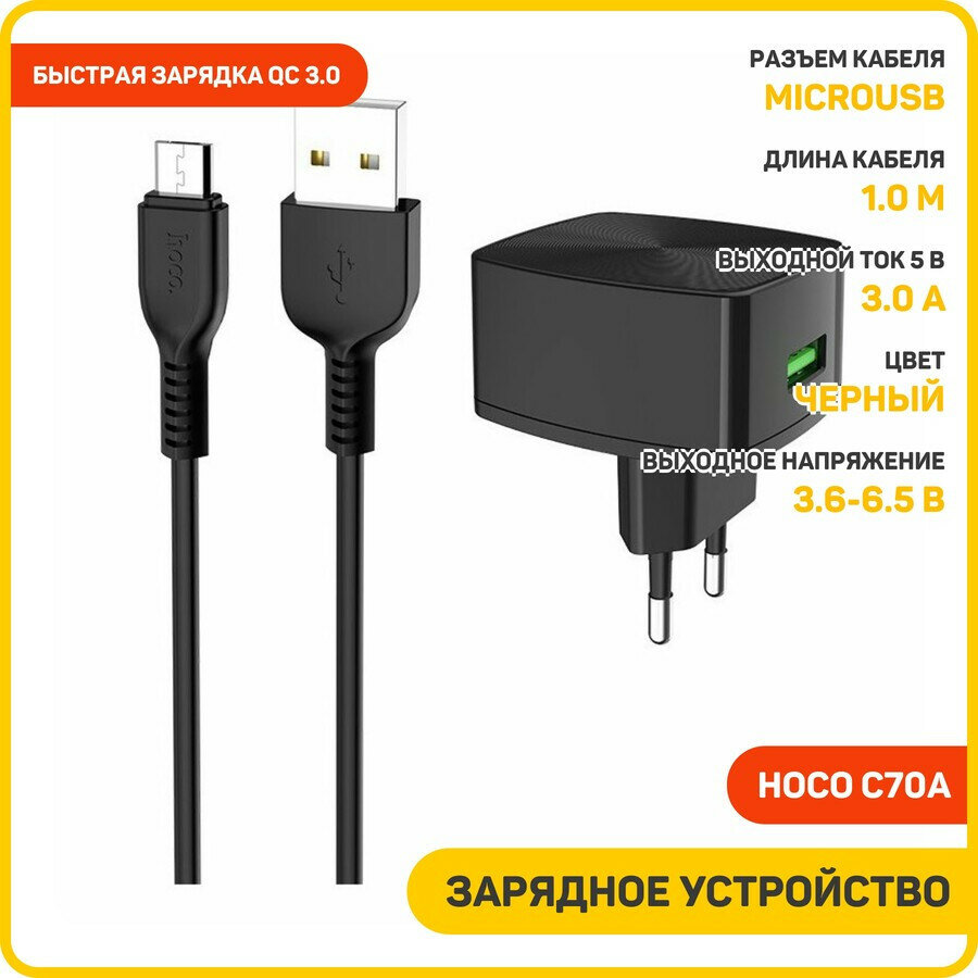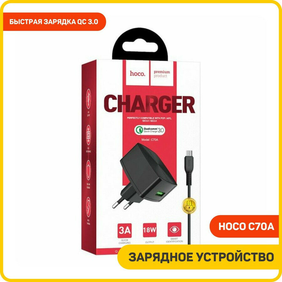 Сетевое зарядное устройство (СЗУ) Hoco C70A QC 3.0 (USB) + кабель MicroUSB, 3 A, черный