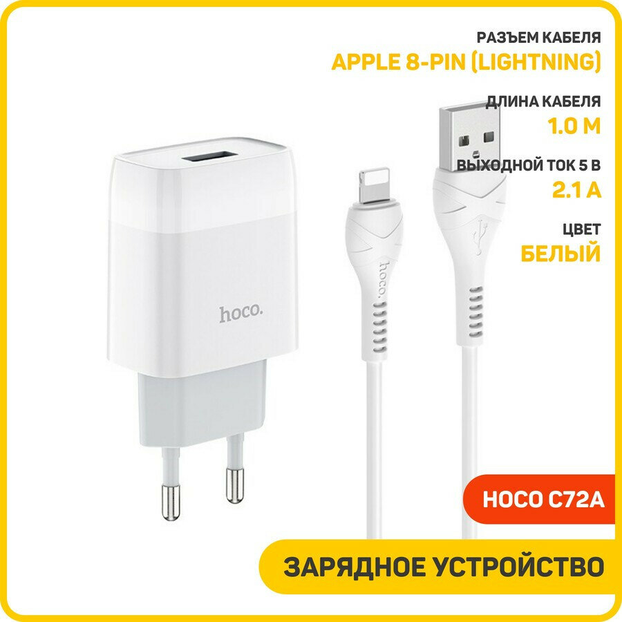 Сетевое зарядное устройство HOCO C72A Glorius single 1xUSB с Кабелем USB - Lightning, 2.1A, 10W, белый