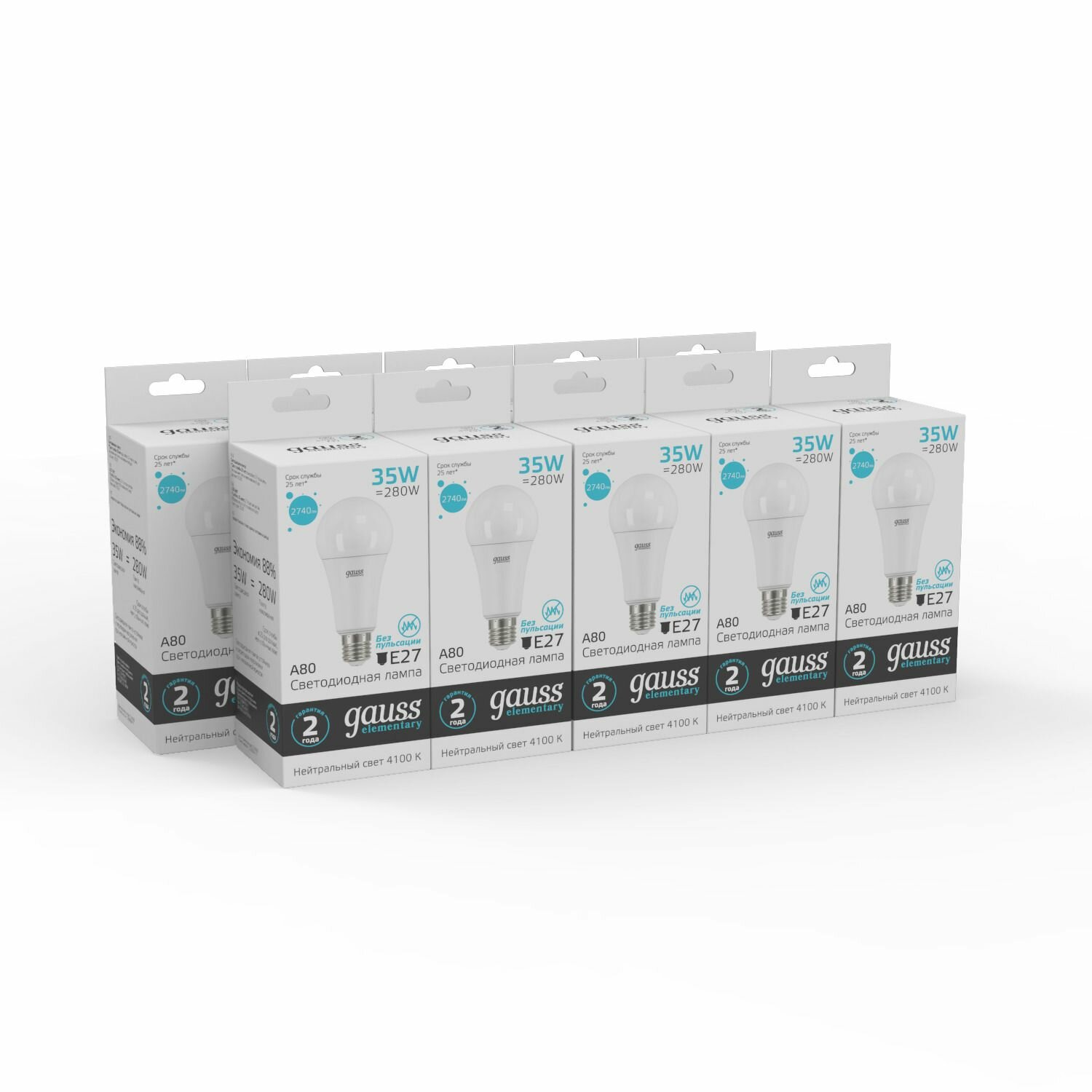 (5 шт.) Светодиодная лампочка Gauss Elementary ЛОН A67 E27 35W(2740lm) 4100K 4K 143x67 матовая, пластик/алюм. 70225 Нейтральный белый. Цоколь E27