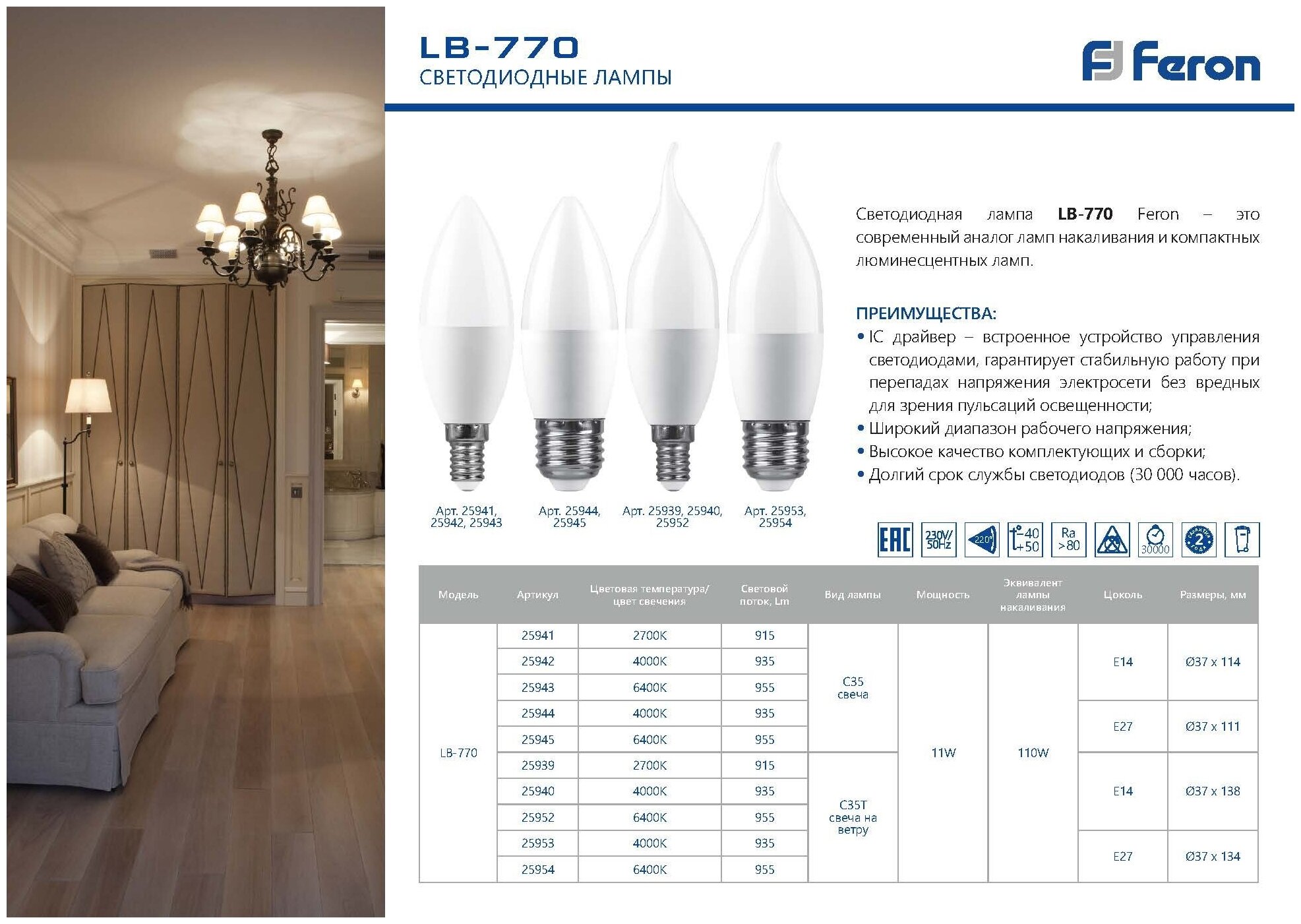 Лампочка светодиодная Feron LB-770, 25941, 11W, E14 (комплект 10 шт.)