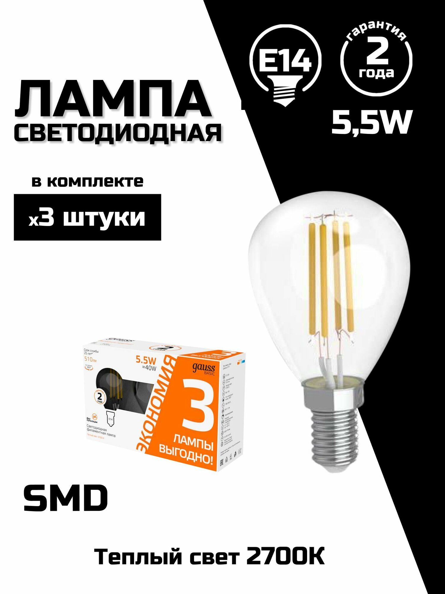 Лампа светодиодная gauss Лампа Gauss Basic Filament Шар 5,5W 510lm 2700К Е14 LED (3 лампы в упаковке) 1/20, E14, P45, 5.5 Вт, 2700 К