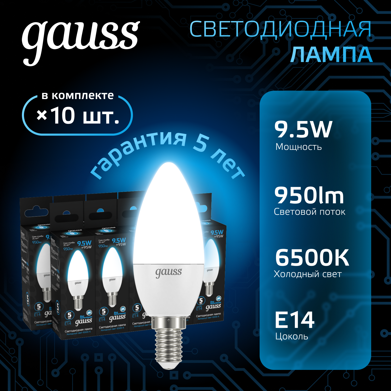 Упаковка ламп LED GAUSS E14, свеча, 9.5Вт, 103101310, 10 шт.