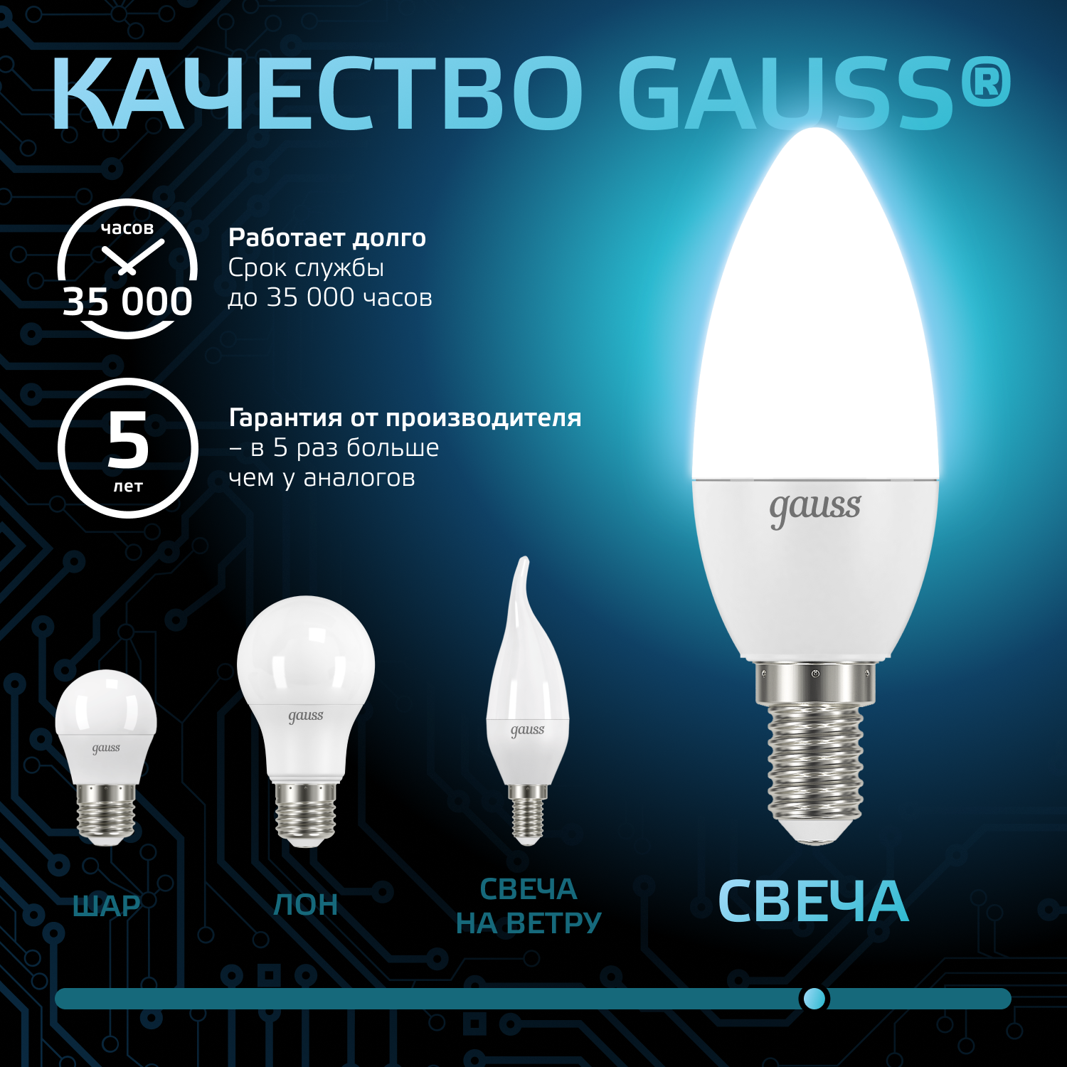 Лампочка светодиодная E14 Свеча 6.5W нейтр-белый свет 4100К упаковка 10 шт. Gauss