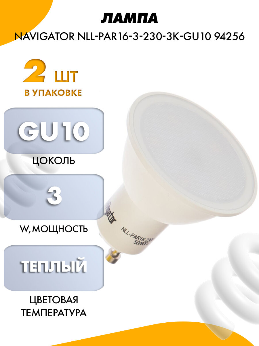 (2 шт.) Светодиодная лампочка Navigator PAR16, мощность 3 Вт, напряжение питания 220 В, цветовая температура 3000 K, теплый белый свет, цоколь GU10, размер 50х59 мм, NLL-PAR16-3-230-3K-GU10