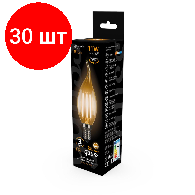 СохранитьКомплект 30 штук, Лампа светодиодная Gauss Filament 11W Е14 Свеча на ветру 2700К 104801111 интересное: