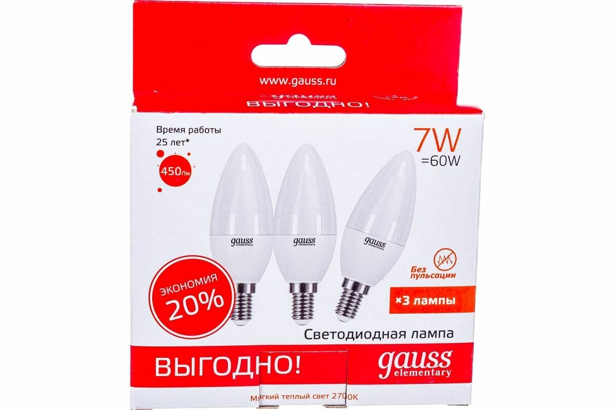 Светодиодная лампа GAUSS LED Elementary Candle 7W E14 2700K (3 лампы в упаковке)