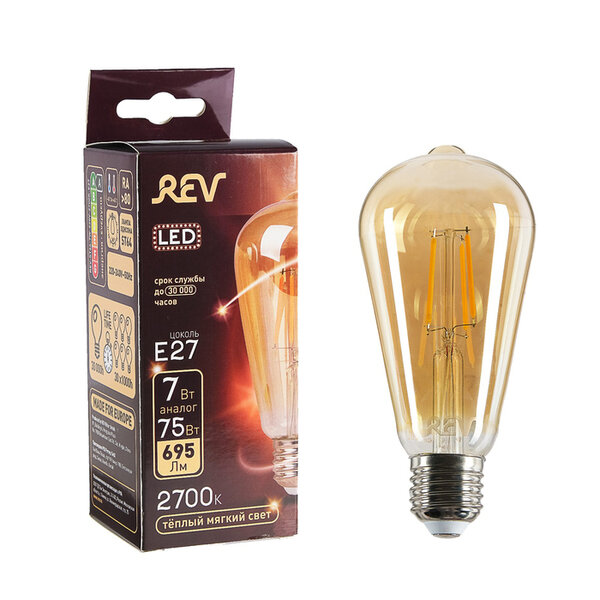 REV Лампа светодиодная REV LED FILAMENT VINTAGE, ST64, 7 Вт, E27, 2700 K, теплый свет