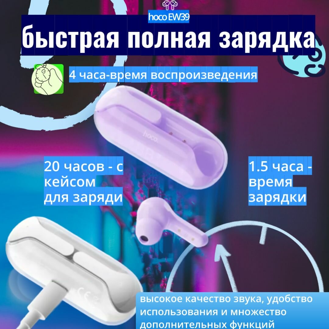 Наушники Hoco Ew39, Tws, беспроводные, вакуумные, шумоподав, BT 5.3, 30/300 мАч, фиолетовые Hoco 988