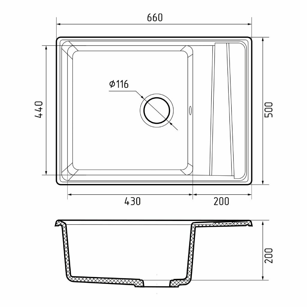 Кухонная мраморная мойка GranFest LEVEL GF-LV-660 L, прямоугольная, врезная, оборачиваемая, 660*500 мм, цвет черный/Раковина для кухни