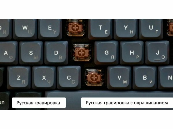 Русские буквы почти не подсвечиваются, но это уже особенности строения свитчей. В темноте их видно, и хорошо. |