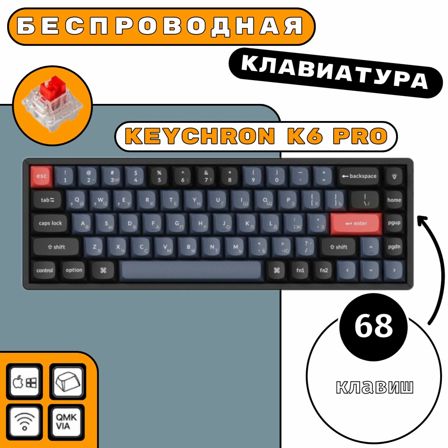 Беспроводная клавиатура QMK Keychron K6 Pro - 68 клавиш (Hot-Swap, Keychron K pro Red Switch)