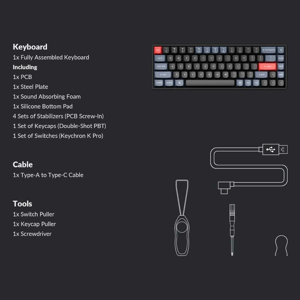 | Комплектация | клавиатура, кабель USB-A - USB Type-C, инструмент для снятия клавиш, инструмент для извлечения переключателей (только версии с HotSwap), сменные клавиши для MacOS / Windows 5 шт., руководство по эксплуатации |