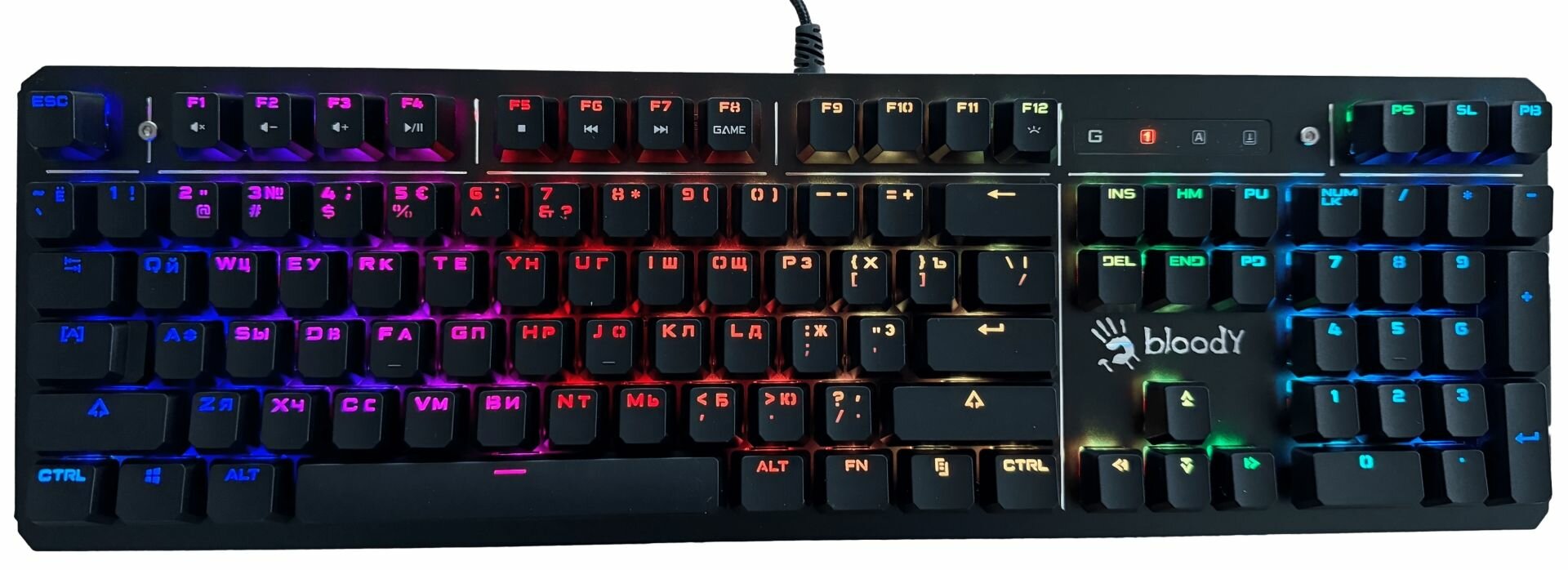 | Плюсы: | Клавиатура очень качественная. LightStrike 3 от Bloody работают на ура. Чувствуется каждое нажатие. RGb подсветка, металлическая конструкция. Комбицаии клавиш для управления звуком. Свичи оранжевые приехали. Оплетка кабеля. Клавиши не болтаются, как у моделей пониже |