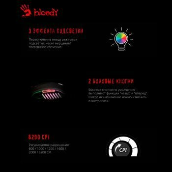 | Минусы: | Нет фирменного ПО Bloody, невозможно переназначить боковые кнопки на мышке.