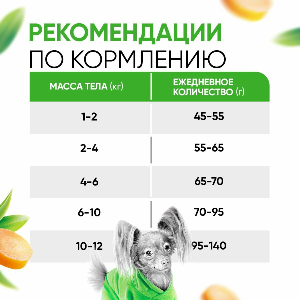 | Дозировка | - вес собаки до 2 кг: 35 г/сут. - вес собаки 2-4 кг: 35-45 г/сут. - вес собаки 4-6 кг: 45-85 г/сут. - вес собаки 6-10 кг: 85-175 г/сут. |