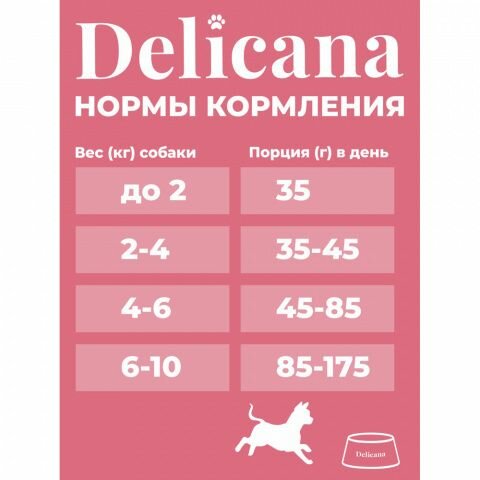 | Дозировка | - вес собаки до 2 кг: 35 г/сут. - вес собаки 2-4 кг: 35-45 г/сут. - вес собаки 4-6 кг: 45-85 г/сут. - вес собаки 6-10 кг: 85-175 г/сут. |