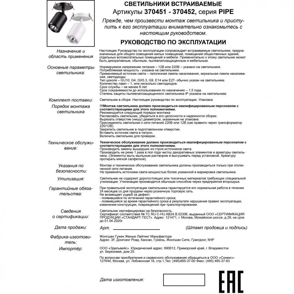 Встраиваемый белый 370452 светильник IP20 GU10 50W 220V PIPE
