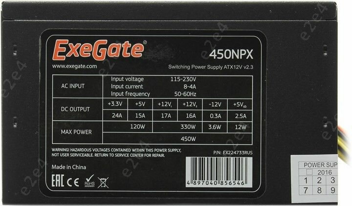 Блок питания 450W ExeGate 450NPX (ATX, 12cm fan, 24pin, 2x(4+4)pin, 2xPCI-E, 5xSATA, 3xIDE, black) EX224733RUS