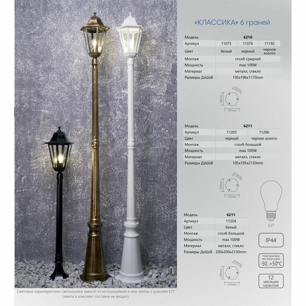 Садово-парковый светильник 6210 11192, E27, 100 Вт, цвет арматуры черное золото