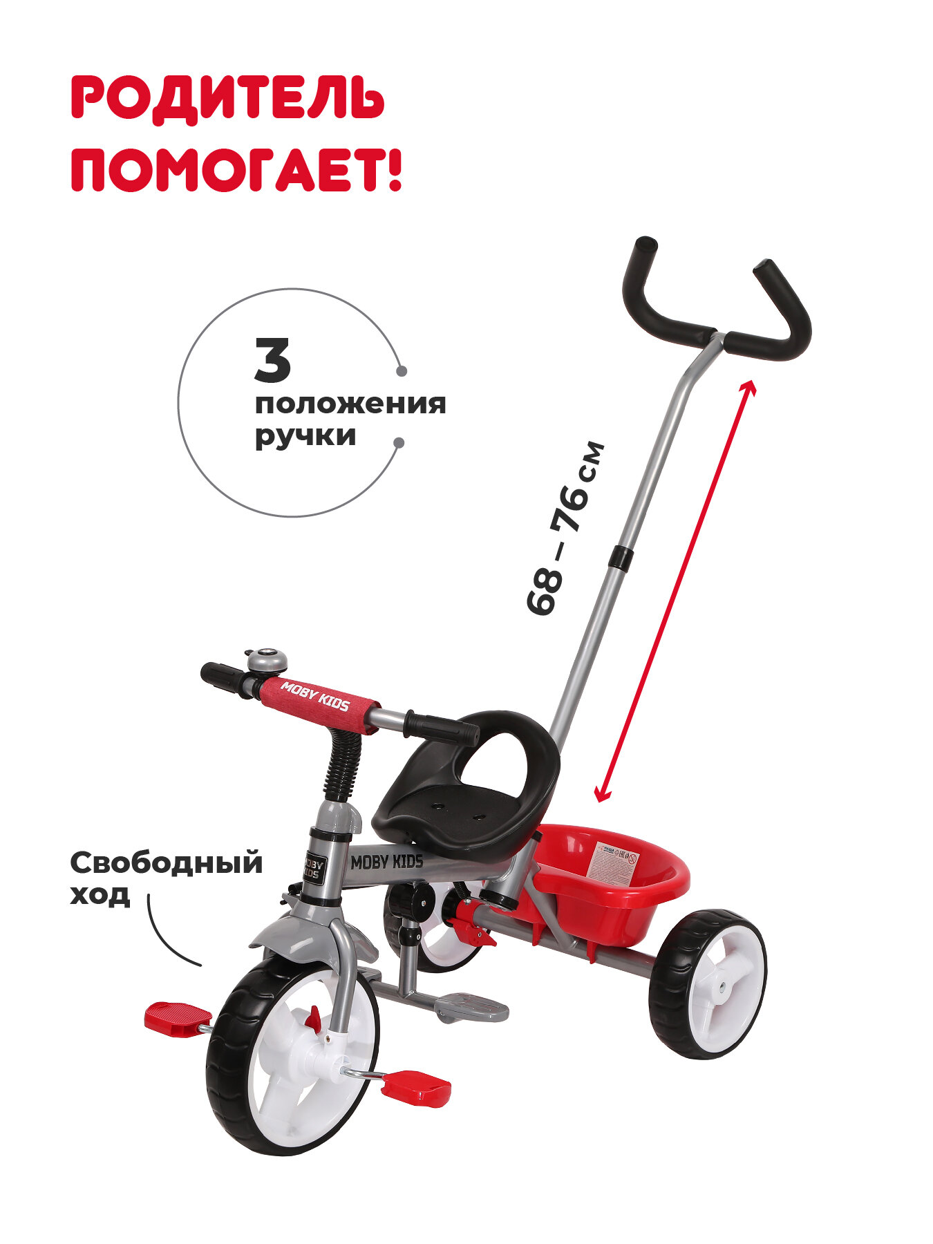 Велосипед детский трехколесный Moby Kids с ручкой управления, трансформер 3 в 1, красный