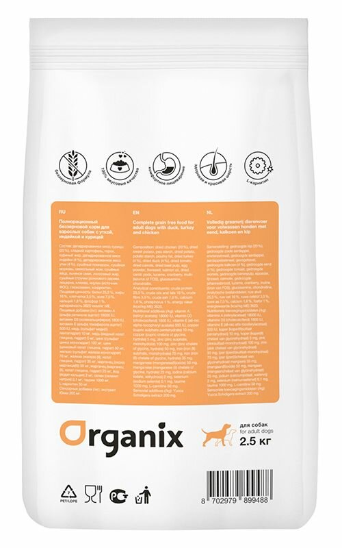 Купить Organix полнорационный беззерновой сухой корм для активных взрослых собак 3 вида мяса: утка, индейка и курица, 2,5 кг