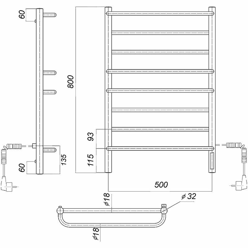 | Дополнительная информация | Полотенцесушитель в сборе 1 шт., Комплект для скрытого подключения 1 шт., Провод с вилкой 1 шт., Кронштейн к стене - 4 шт., Паспорт на изделие |