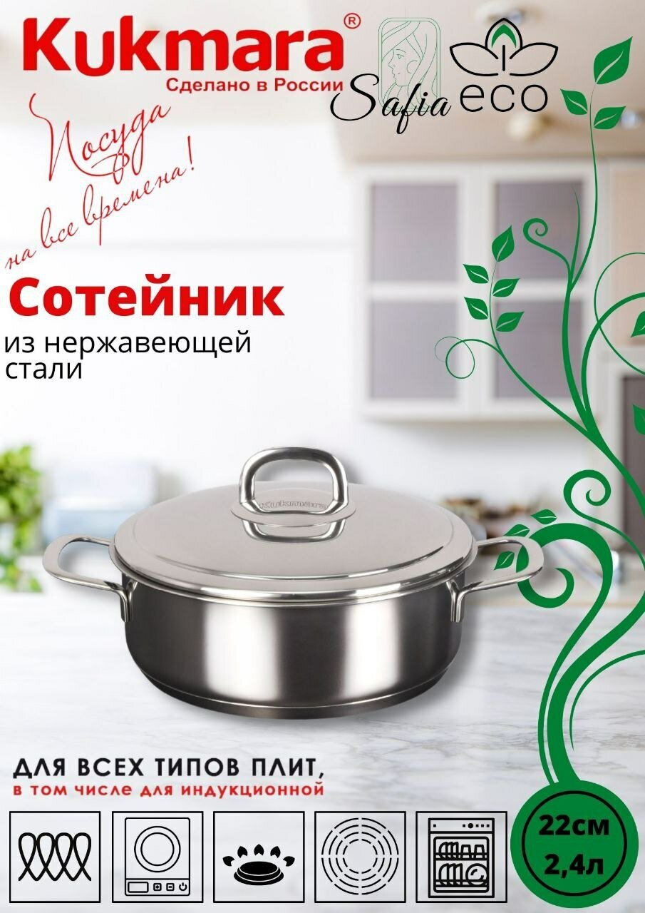 Сотейник Kukmara из нержавеющей стали 22 см со стеклянной крышкой, линия "Safia", 2.4 л