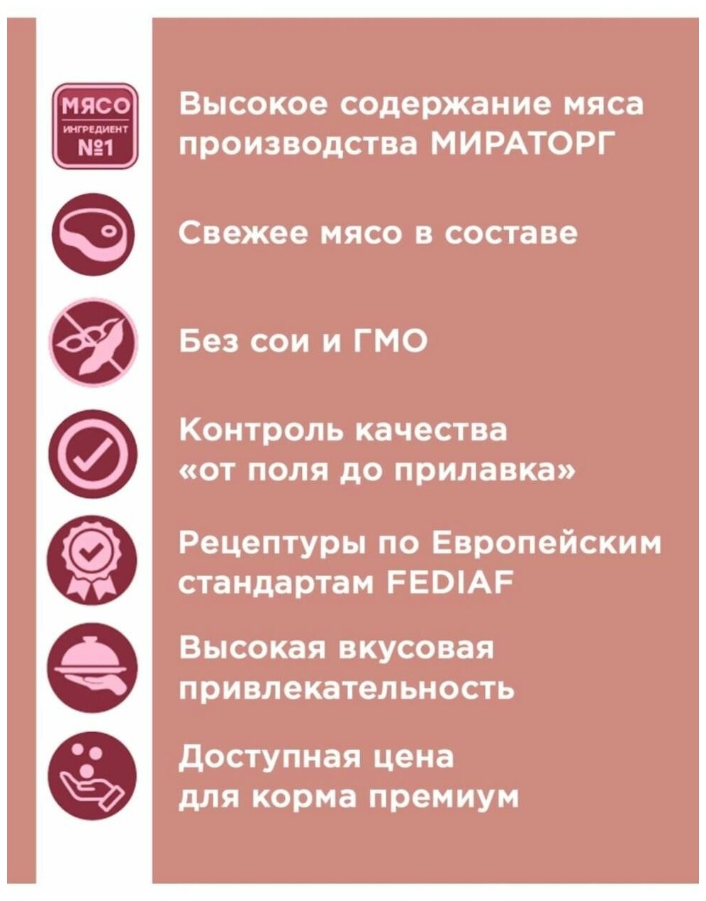 | Состав | мясо и мясные ингредиенты – 43% (дегидрированное куриное мясо – 33%, свежая говядина – 10%), кукуруза, экстракт растительного белка, рис, животный жир, высушенная мякоть свеклы, гидролизат белков животного происхождения, дрожжи пивные, минеральные вещества, лососевый жир, витамины, соль, экстракт цикория, L-карнитин. |