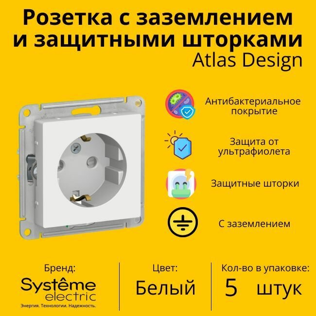 Розетка с заземляющим контактом, со шторками, механизм Монтаж: скрытой установки Цвет: белый Термопласт: антибактериальный, с ионами серебра (Schneider) Systeme Electric AtlasDesign ATN000145 комплект 10шт.