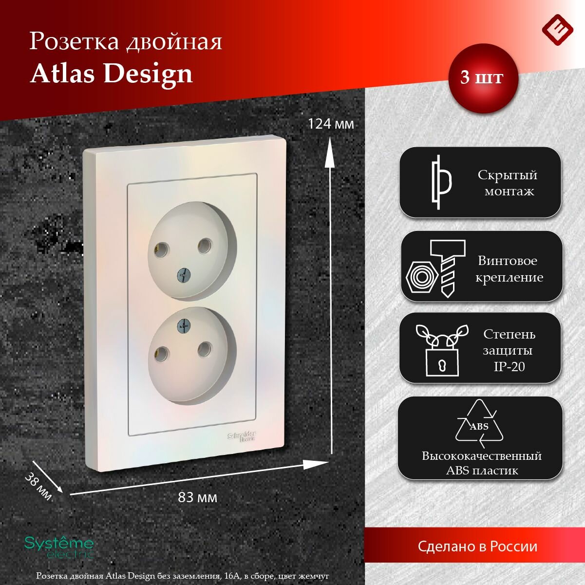 Розетка двойная в сборе Schneider Electric AtlasDesign без заземления, без шторок, 16А Жемчуг (комплект 3шт)