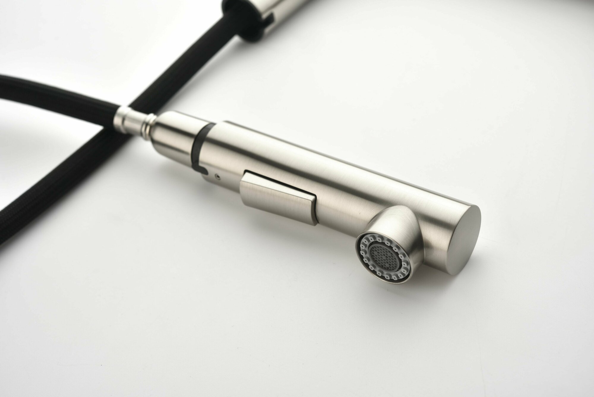 СохранитьСмеситель для кухни с гибким выдвижным изливом Paulmark-Starke NEO, высокий поворотный излив, режимы струя / душ, однорычажный, латунь, на мойку / столешницу, никель, Ne214419-Ni интересное: