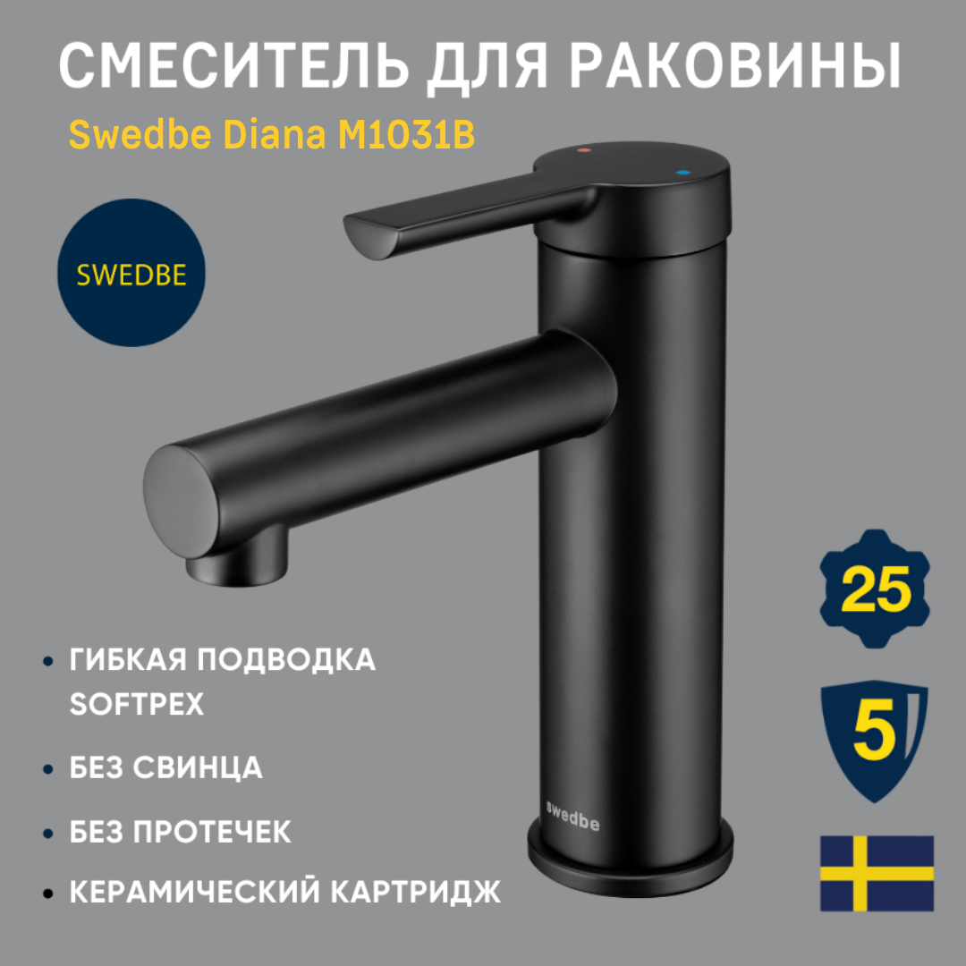 Смеситель для умывальника Swedbe Diana 1010В однорычажный, длина излива 116,2 мм, черный матовый